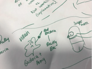 antibiotic resistance. The group expressed the importance of keeping the performance simple and fun so that young people especially primary school aged children would be able to understand the storyline and science embedded into the script. Of course there had to be ‘super hero’ character’s as well as ‘villains’ which fits nicely into the theme of good and bad bacteria, which some young members of the group hadn’t considered.